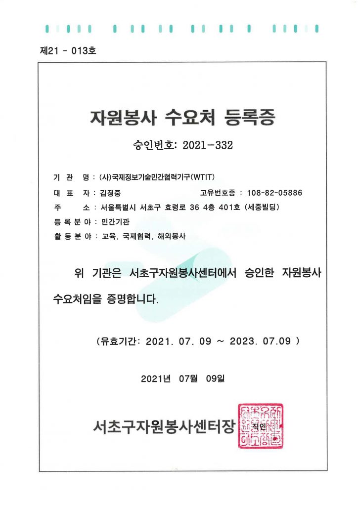 WTIT는 서초구자원봉사센터 산하 자원봉사수요처로 정식 등록되어 있으며, 관리자 교육을 이수한 기관입니다.